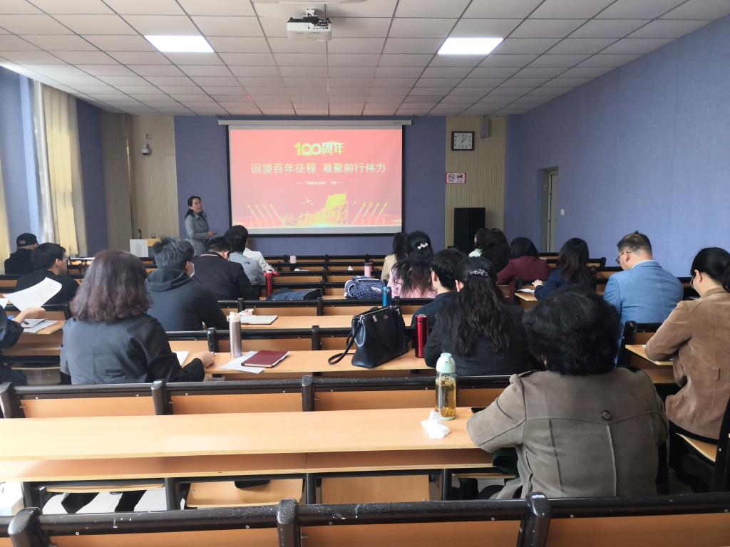 4月28日,马克思主义学院在艺文楼一楼报告厅开展党史学习教育宣讲暨讲党课活动,党总支书记兼院长刘荣主讲,教师党支部全体党员现场聆听了授课。